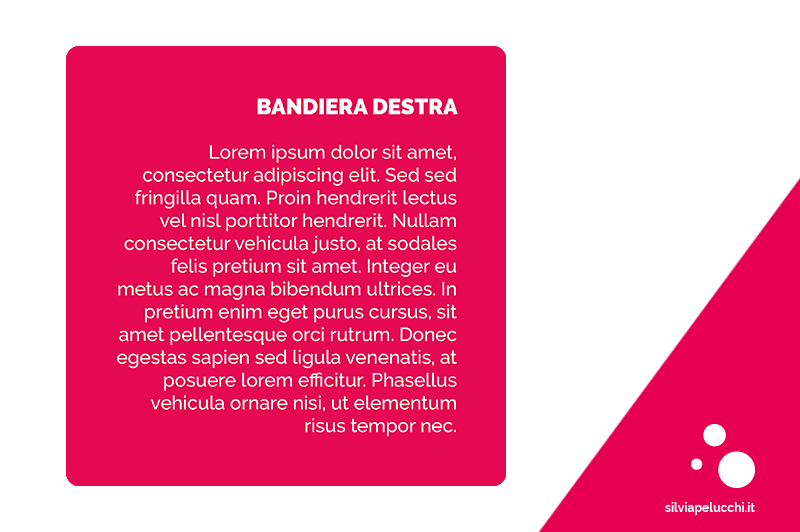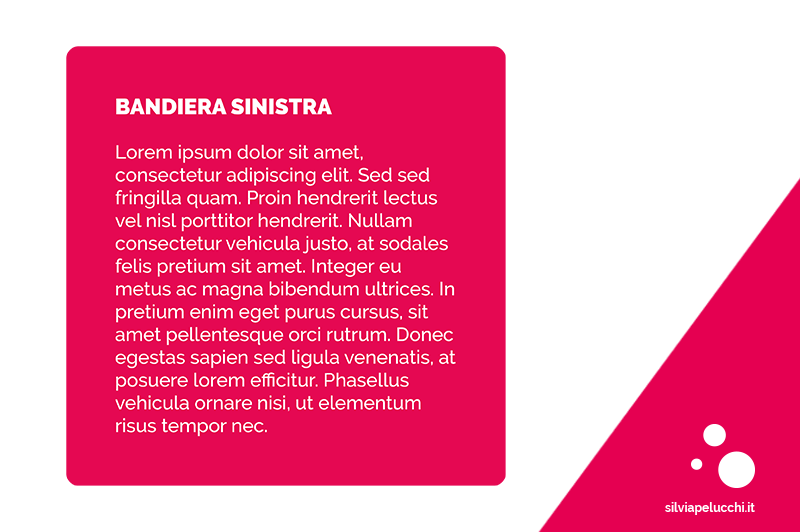 Le linee dell’impostazione a bandiera sinistra sono tutte allineate sul lato sinistro. è l’allineamento più usato in quanto porta numerosi vantaggi come per esempio l’omogeneità degli spazi tra le parole che è dato dal carattere che vogliamo usare e non varia da riga a riga come nel giustificato, ha una buona leggibilità in quanto segue l’andamento naturale della scrittura occidentale, attenzione però a non andare a capo troppo spesso spezzando le parole.
