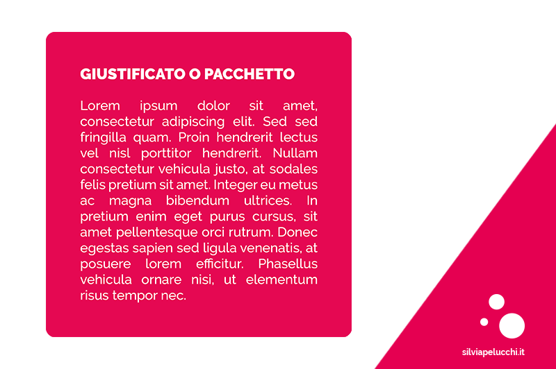 Le linee dell’impostazione a pacchetto hanno tutte la stessa lunghezza. Per avere questo risultato, ogni riga viene adattata alla lunghezza che decidiamo noi, tuttavia è un tipo di allineamento che definisco “scomodo” in quanto soprattutto se la giustezza di un testo è molto stretta si rischia di avere troppi spazi bianchi tra il testo perchè vengono forzati i millimetri che si trovano tra le parole influenzando in maniera negativa la lettura.